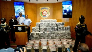 Posteriormente, se realizó un operativo de búsqueda en aguas del Caribe, a varias millas náuticas al sur de Baní, donde lograron recuperar cuatro pacas que contenían los 114 paquetes, de presunta cocaína, envueltos en cinta adhesiva y marcados con distintos logotipos.