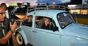 Su aparición en el lugar fue motivo de atención, ya que llegó a la librería en un ‘cepillo‘, un carro Volkswagen de 1970 verde que le facilitaron unos amigos, seguido por otros vehículos del mismo modelo y varios agentes que, en motocicletas, cuidaban su desplazamiento por la capital dominicana.