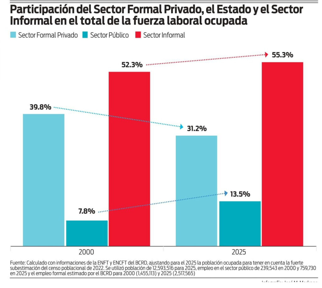 Con el perdón de mis amigos economistas, no me parece sensato que permanezcamos de brazos cruzados frente a una conquista, auxilio o derecho basado en principios morales y sociales que todos defendemos pero que, sin proponérselo, ha erosionado la capacidad del sector formal privado de crear empleos y expandido la participación del sector público y del sector informal en la absorción de empleo en el país. Si ajustamos el dato poblacional de 10,878,267 habitantes que sirve de base a la muestra de la Encuesta Nacional Continua de Fuerza de Trabajo del BCRD al nivel de 12,593,516 para corregir por la subestimación del censo de 2022, mantenemos invariable la tasa de desocupación oficial y reconocemos que cualquier incremento de la población ocupada derivado de la corrección de la subestimación poblacional solo puede tener lugar en el sector informal, se puede comprobar que entre 2000 y 2025, mientras las tasas de crecimiento anual promedio del empleo en el sector público y en el sector informal fueron de 4.73% y 2.72%, respectivamente, la correspondiente al sector formal privado fue de apenas 1.49%. Con el ajuste para corregir la subestimación poblacional tendríamos que, en 2025, los ocupados en el sector formal equivaldrían al 44.7% del total de ocupados, de los cuales 31.2% corresponden al sector formal privado y el 13.5% a los empleados del sector público. El sector informal, por su parte, emplea al 55.3% de toda la fuerza laboral ocupada del país. ¿Han mejorado esos indicadores con relación a los de 25 años atrás? No. En 2000, el sector formal empleaba el 47.7% del total de ocupados, correspondiendo el 39.8% al sector formal privado y el 7.8% a los empleados en el sector público. El sector informal, por su parte, empleaba al 52.3% del total de la fuerza laboral ocupada.