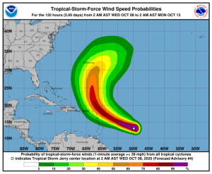 Los meteorólogos pronostican que Jerry se convierta en huracán el jueves y que su centro pase cerca o al norte de las Islas de Sotavento entre el jueves y el viernes, con lluvias de entre 5 y 10 centímetros que podrían causar inundaciones repentinas, especialmente en zonas montañosas.