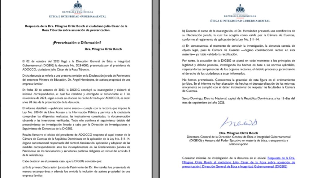 En su declaración pública, Ortiz Bosch señaló que la DIGEIG actuó dentro de los límites de la ley y que nunca hubo prevaricación: